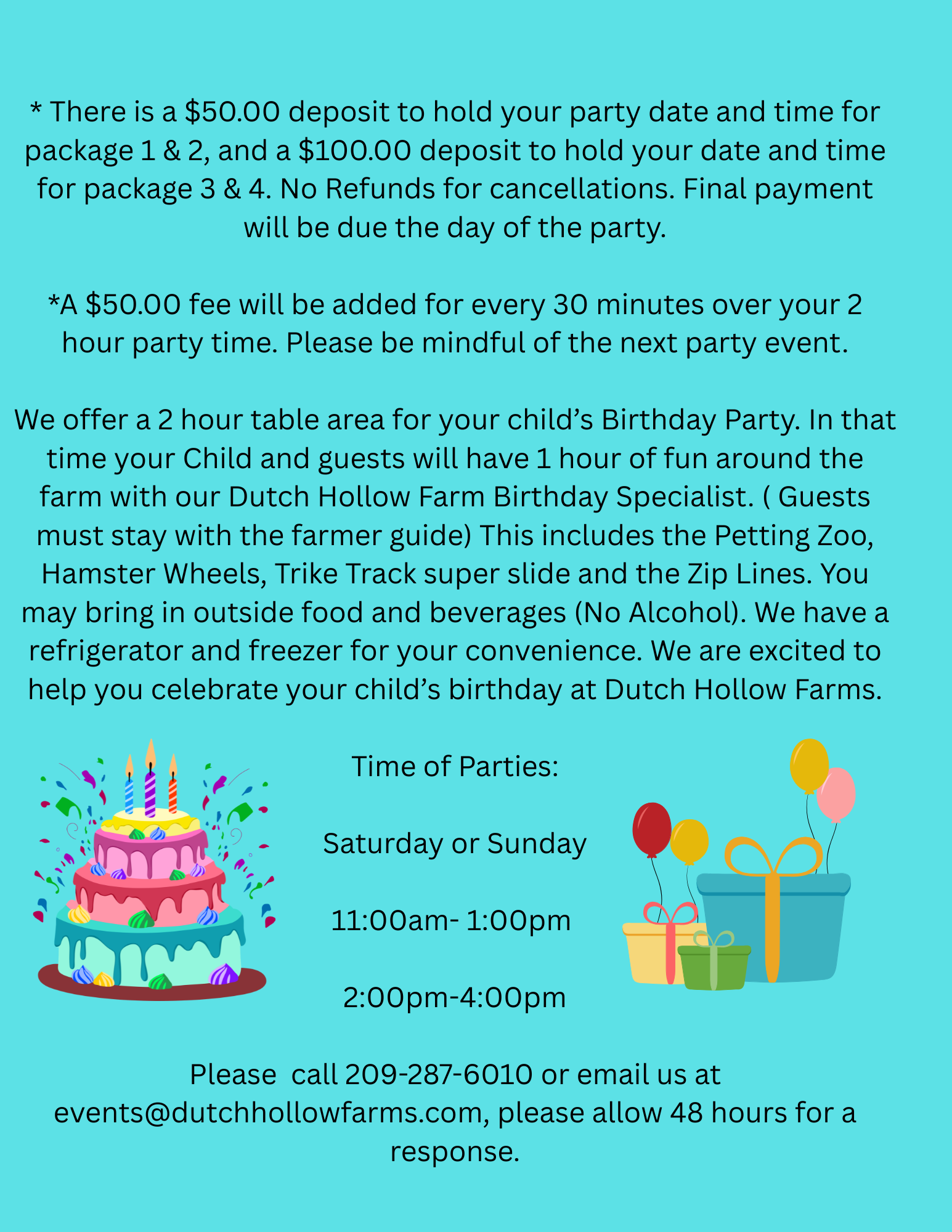 Dutch Hollow is excited to again offer Birthday Parties. We offer a 2-hour table area for your child’s Birthday Party. In that time your child and guests will have 1 hour of fun around the farm with our Dutch Hollow Farm Helper. You may bring in outside food and beverages (No Alcohol). We have a refrigerator and freezer for your convenience. We are excited to help you celebrate your child’s birthday at Dutch Hollow Farms!