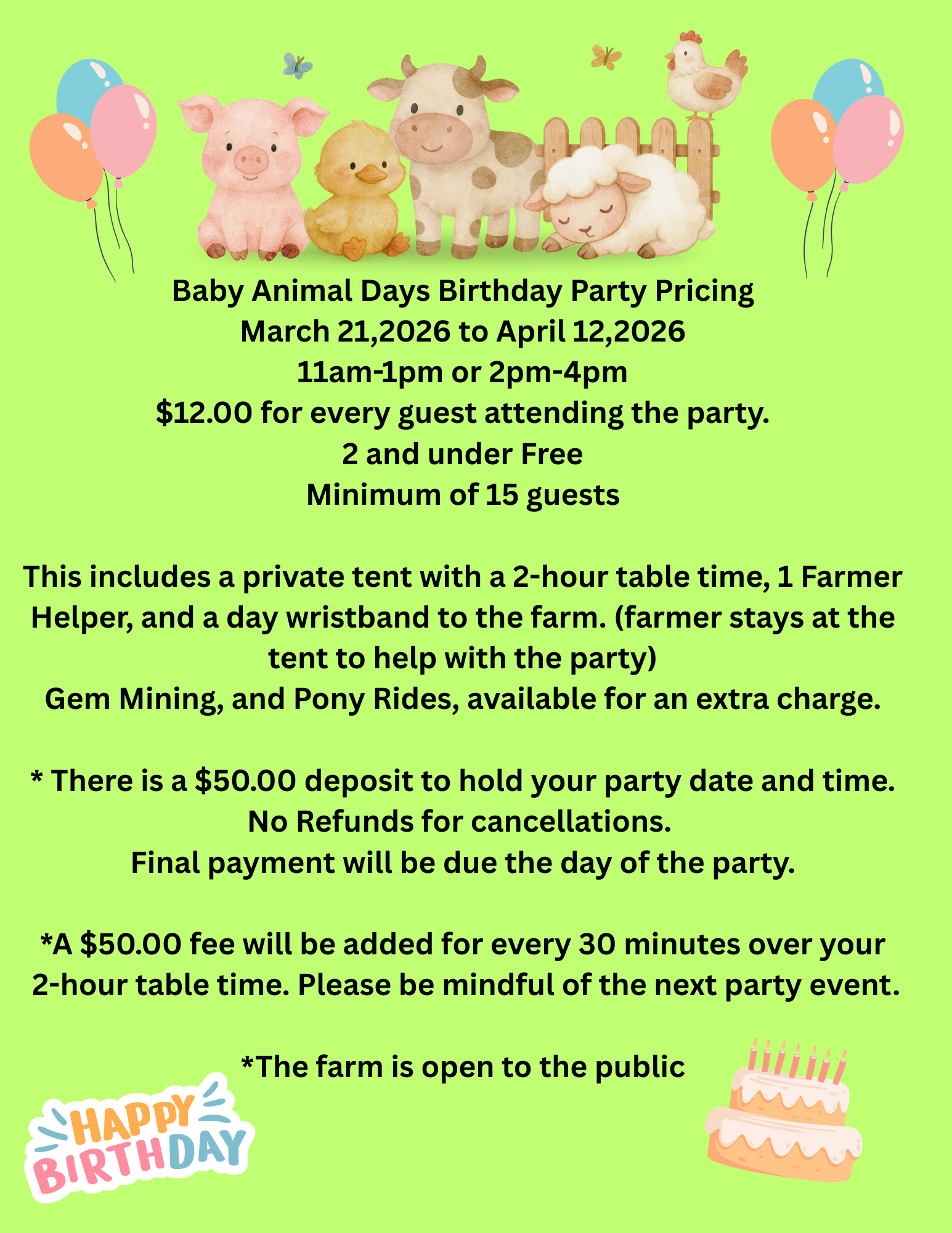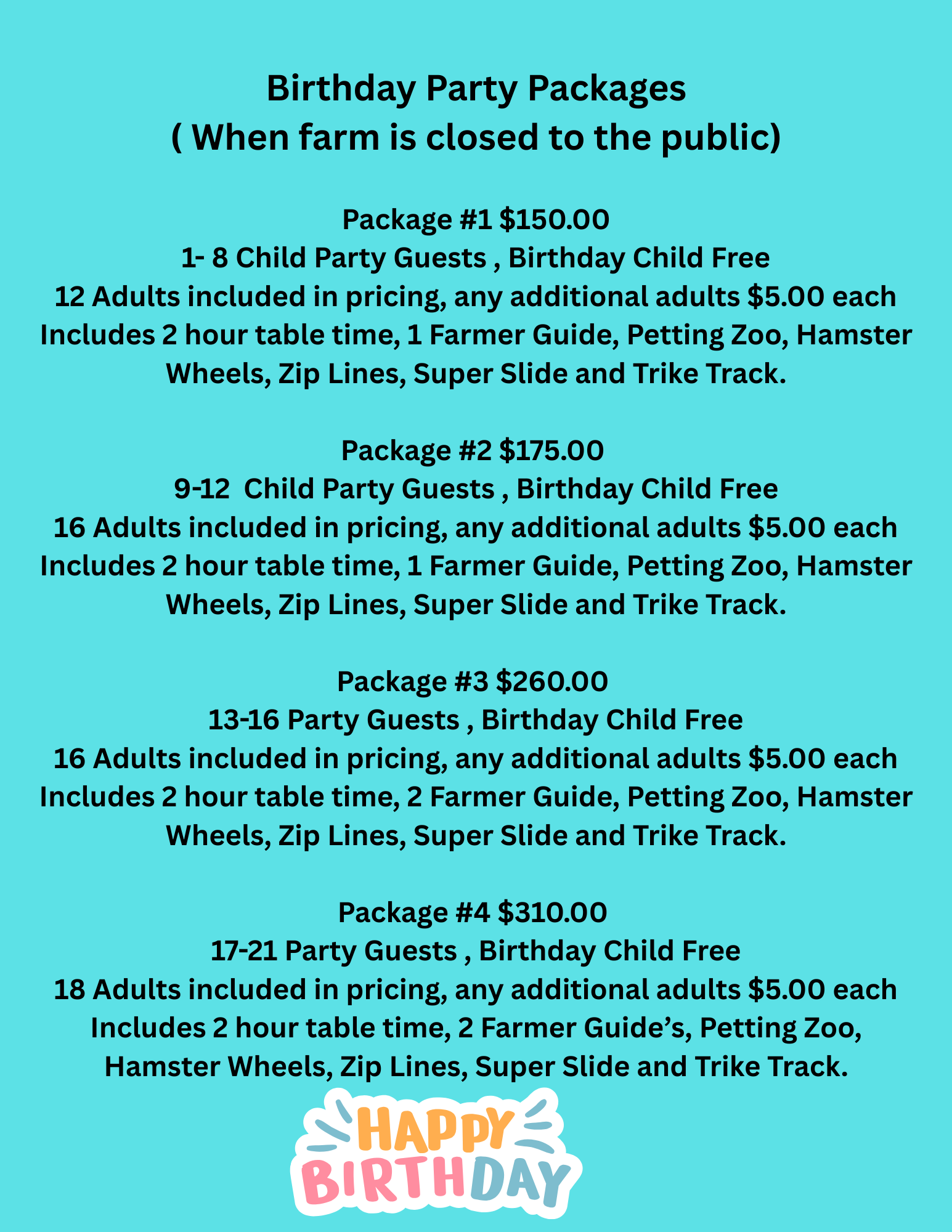 PLEASE NOTE: Pricing for birthday party packages will vary based on the season.